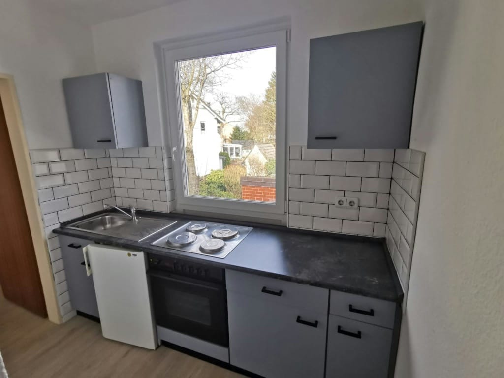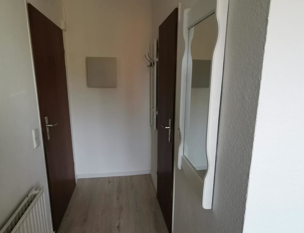 The kitchenette and the bathroom can be reached via the hallway. The kitchen is freshly tiled and is equipped with a cooker and a refrigerator. Particularly noteworthy is the large window, which faces the quiet backyard. The two windows of the flat have been renewed in January 2021 and meet the latest standards. The floor in light wood optics is also freshly laid.